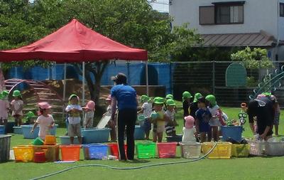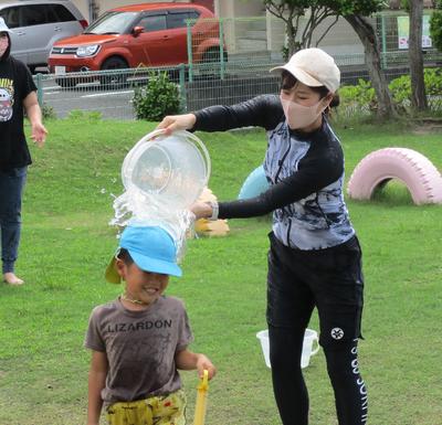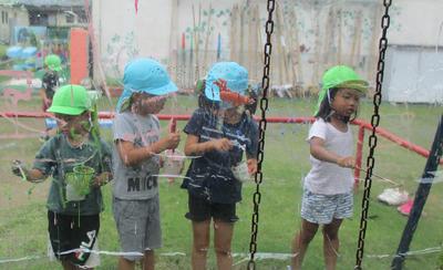 保護者の方も童心に戻り、水の掛け合いです。服が濡れることを気にすることなく、水鉄砲をもって子供に立ち向かっていました。その顔はいつも以上の満面な笑顔で、大きな歓声が園庭に響ていました。